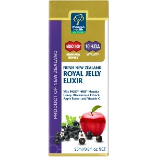 Manuka Health Royal Jelly Elixer is een uniek voedingssupplement en heerlijk romig van smaak. Royal Jelly wordt gemaakt als voedsel dat dient voor de jonge bijen en voor de koningin. Het is het exclusieve voedsel van de bijenkoningin, die ongeveer 6 jaar leeft terwijl werkbijen slechts 6 weken leven. Het enige verschil tussen de koningin en de werkbijen is hun dieet. Manuka Health’s Royal Jelly Elixer wordt geoogst met de grootste zorg door Manuka Health eigen imkers. Onder constante controle over de bijenkorf tot aan het eindproduct zorgt Manuka Health ervoor dat de Royal Jelly de beste kwaliteit en hoogste bioactiviteit behoudt en dat het bijenvolk beschermd en niet uitgebuit wordt. Gemengd met de beste Nieuw Zeelandse fruitextracten zoals Zwarte bes, Appel en Druif – evenals Vitaminen C, E, A en MGO 400+ Manuka Honing zorgt het Royal Jelly Elixer voor een natuurlijke krachtige ondersteuning voor het lichaam.